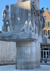 The 22-meter-high column of the National Monument stands on a square base and is made of white natural stone (travertine from Tuscany). The front of the column has a relief of four chained men depicting the horrors of war. To the left and right of the relief are two statues of men, representing the resistance by the intellectuals (left) and the workers (right). The howling dogs at their feet symbolise ‘sorrow’ and ‘loyalty’.